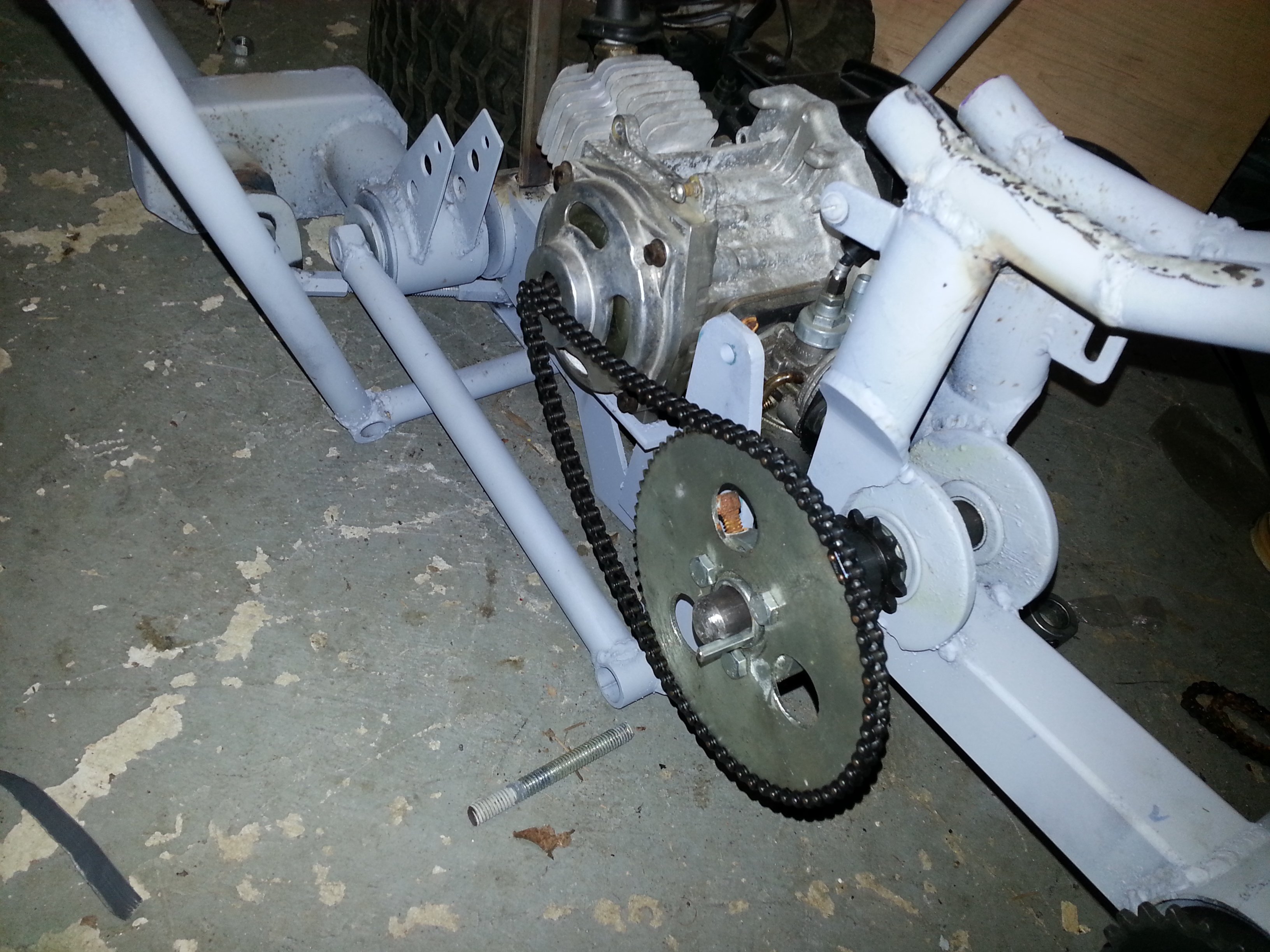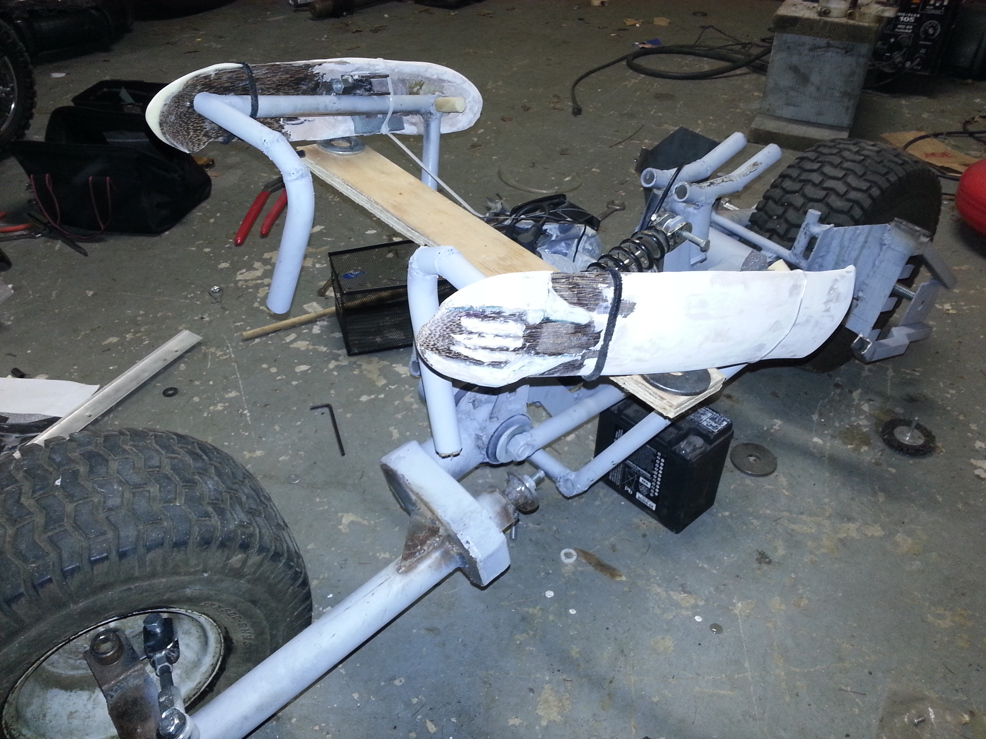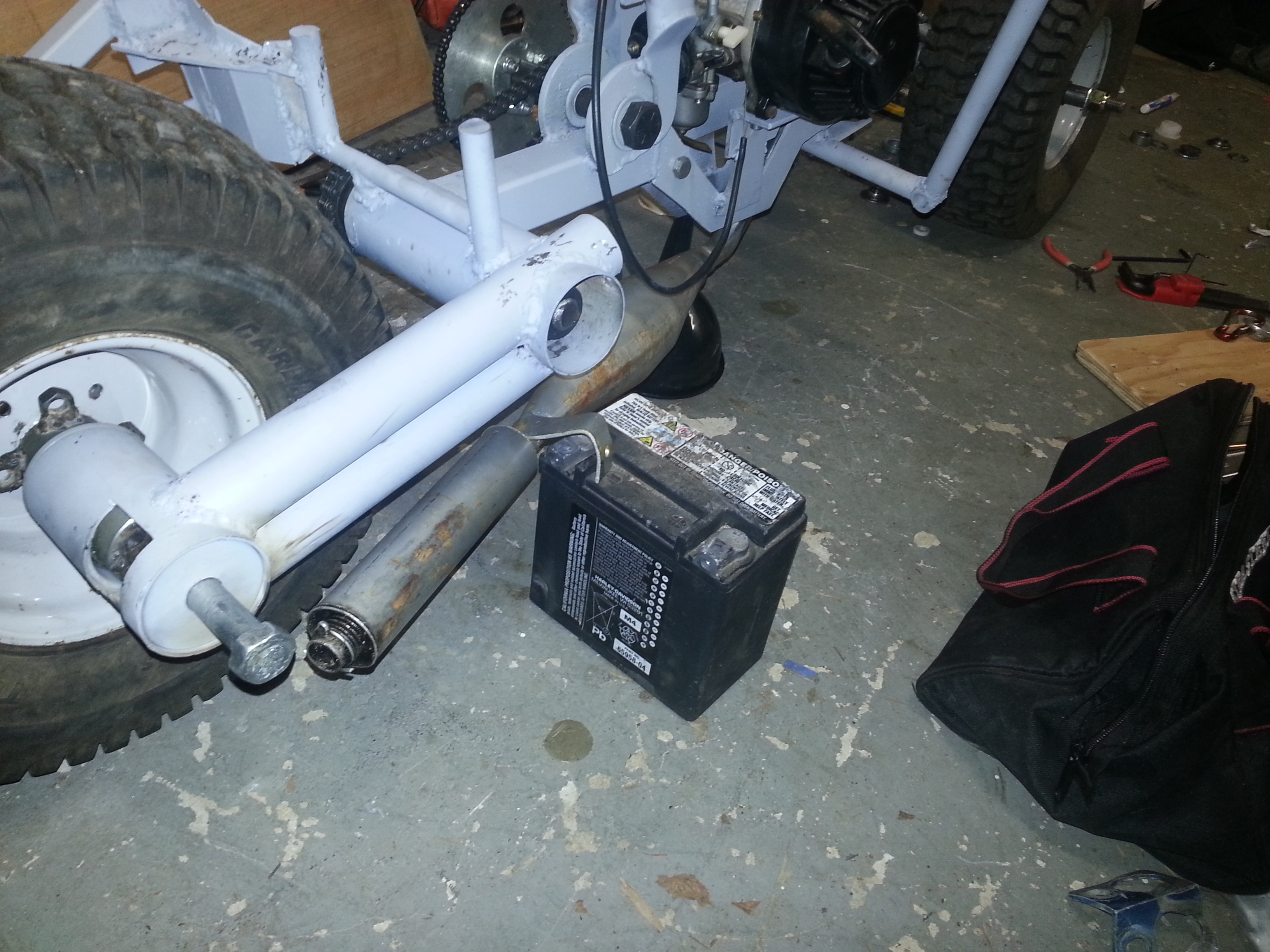 Got a pretty big hurdle out of the way, which was routing the exhaust. The real Batpod, they hid to the exhaust by running it inside the frame to further the illusion that there is no gas motor in it. But this option was easier for them since they used a 4-stroke. I’m using a 2-stroke motor, and the expansion chamber is both required, and can’t be highly modified (at least not easily). So, I took the whole Batpod and the pipe that came with the motor to a friend, Fothergill (thanks again!), who has a good welder, and who himself is a much better welder than me. We modified it to go straight down, back, then angle out. It actually goes between the frame rails under the motor, so a little hard to see what’s going on, but that’s really the point, to have it as hidden as possible.