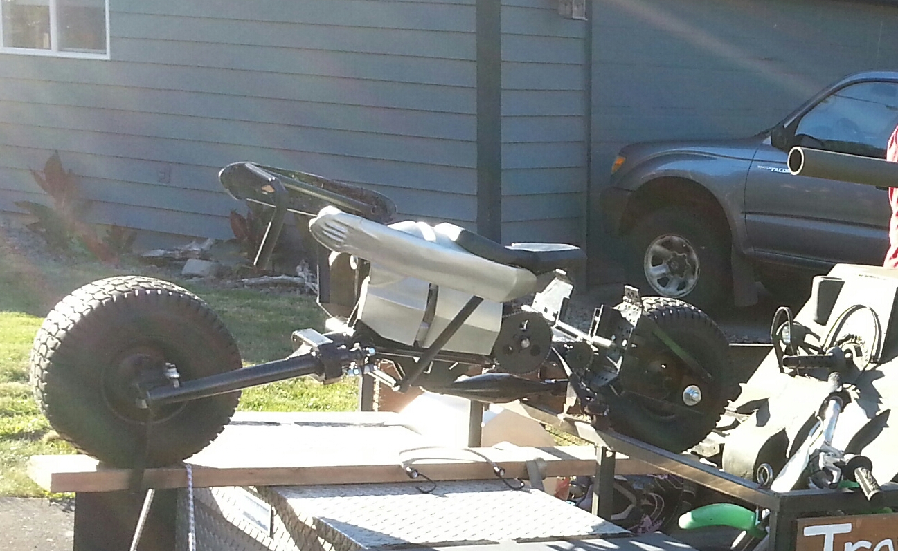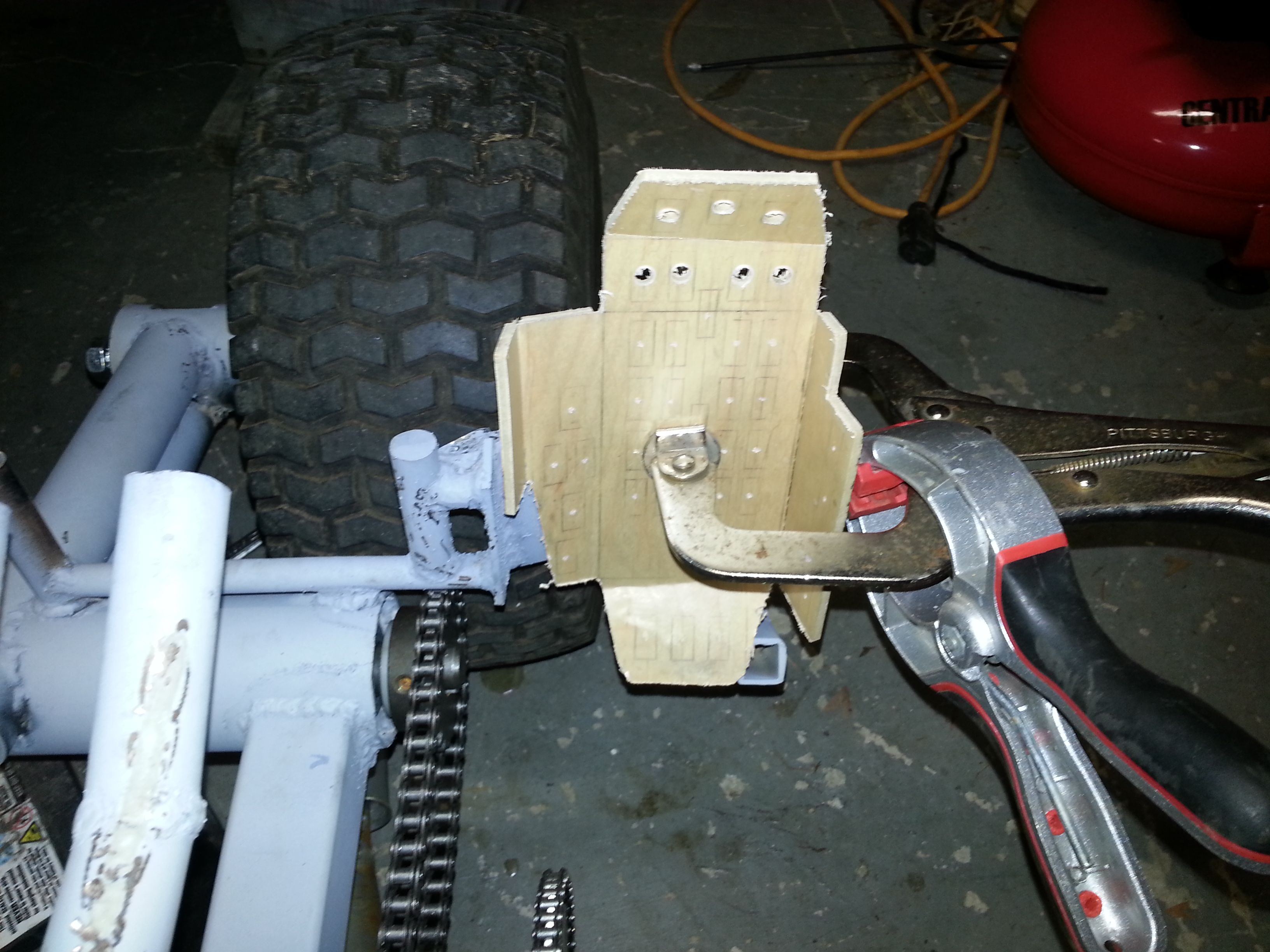I also made one of the chain-guard/covers to protect the rider, and hide the chains. Still need to make one more for over the big sprocket. Then I threw everything together to be on TV.