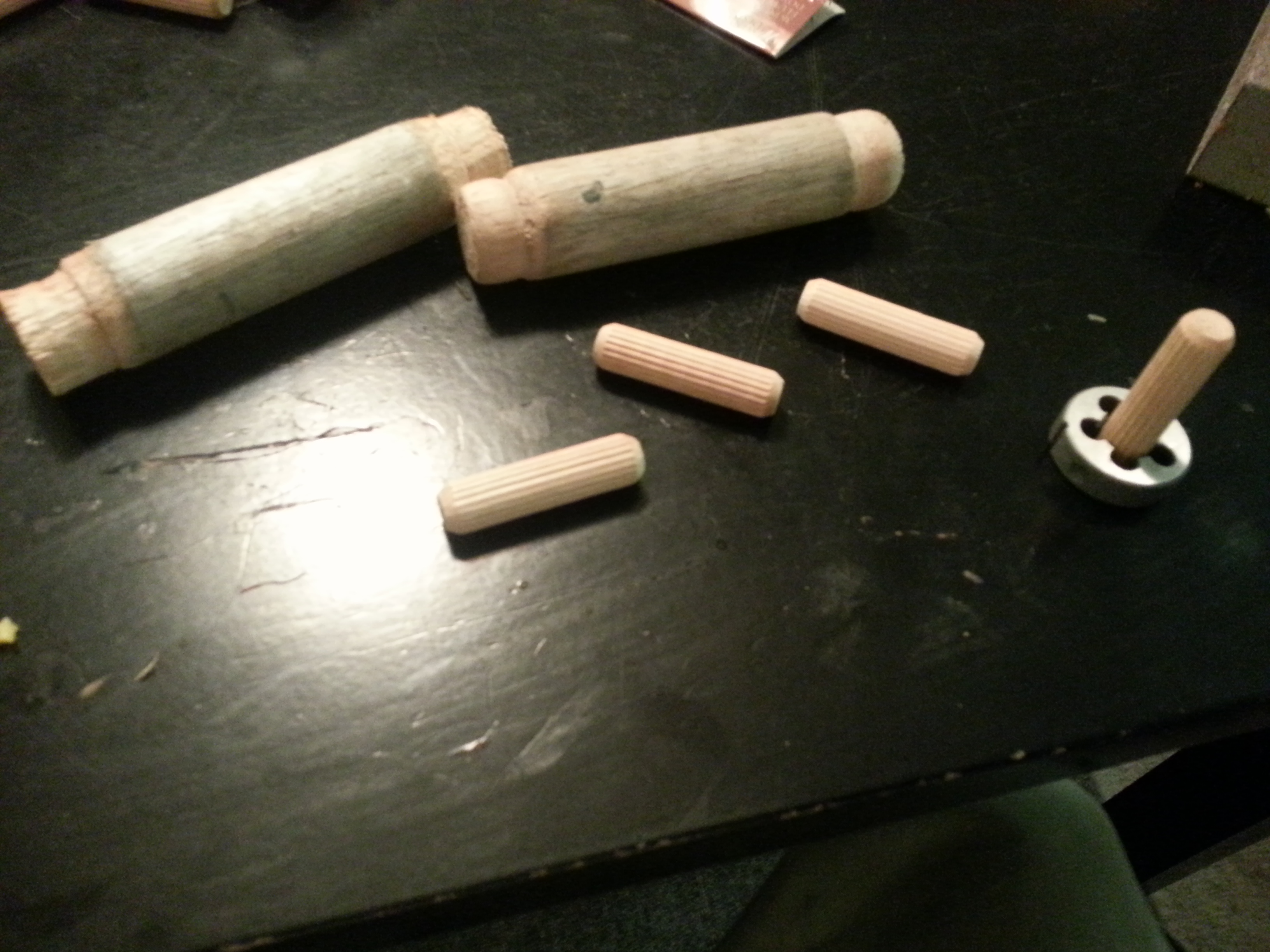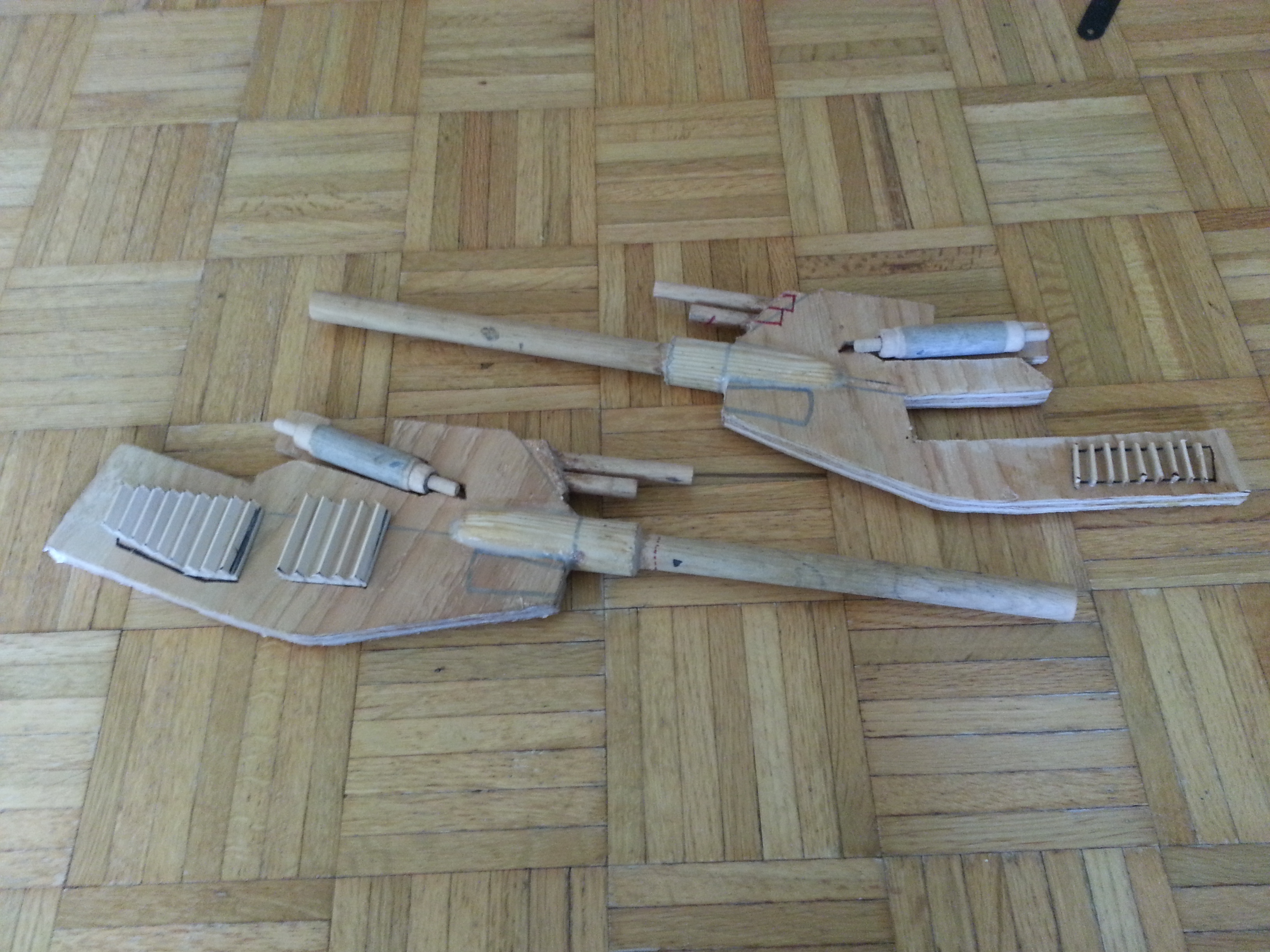 I made the louvered sections out of Popsicle sticks, for the sides of the guns. Made the shocks out of dowel, and cut threads into some dowel pins for the ends.