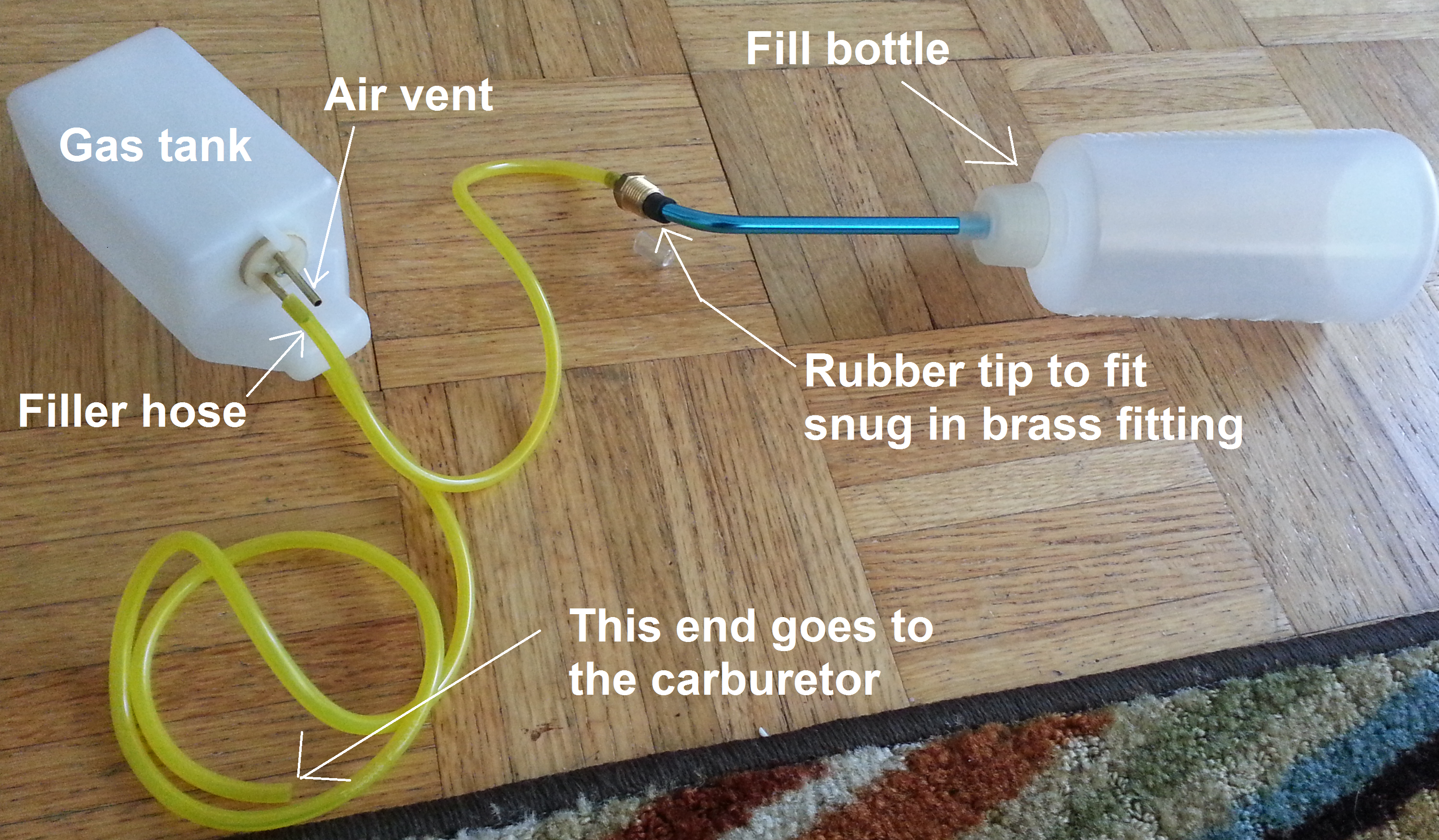 I got a gas tank from an RC airplane, and ran the lines as shown, it’s an 11oz tank, that you can quickly refill with the fill bottle: